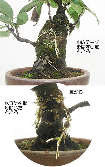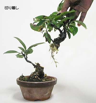 花付きの良い樹種。途中から良い曲があるので取り木をして2本にする。前後に発根、不要枝を切って植え付ける。本体も1本の細枝が残った。伸ばして枝もとを太くして仕立てる。