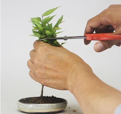 油断すると枝が太り姿を乱してしまう。高木性なので上に伸びやすい樹種。手で軽くにぎり、ハサミで水平に切りつめる。手を離すと弧状の枝先になる。