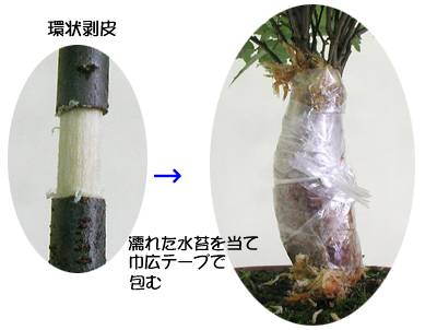 根のほしいところを環状剥皮し、濡らした水苔を当て、巾広テープで固定すれば8月下旬には切り離しできるはずです。